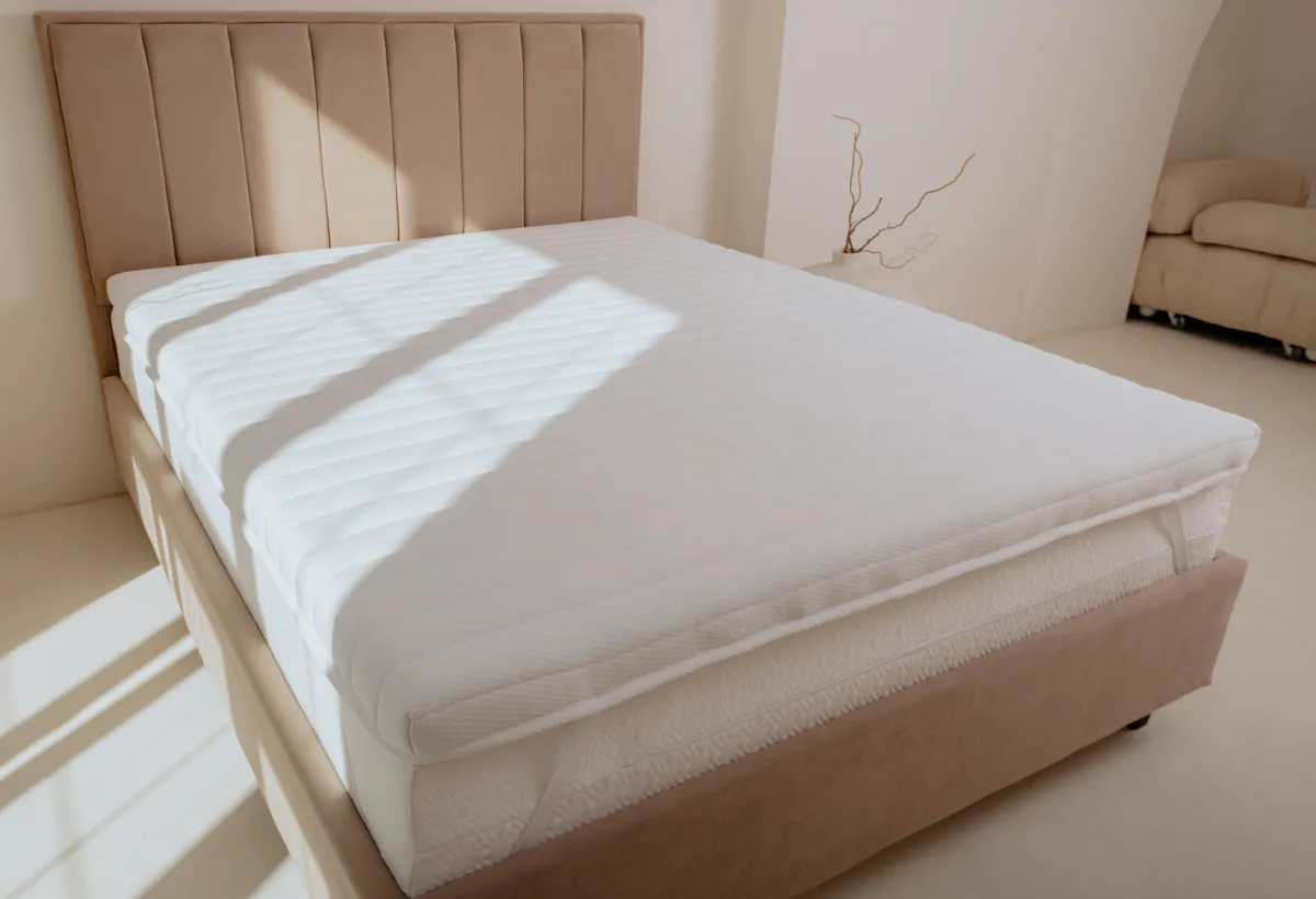 Топпер «Мелисса»: упругость и релаксЭтот топпер создан, чтобы помочь вам по-настоящему расслабиться. Он не жёсткий, а упругий и отзывчивый — тело на нём не проваливается, а мягко поддерживается. Всё дело в двух слоях пены. Нижний, 2 см, — это плотная основа для поддержки. Верхний, 3 см, — пена с рельефной поверхностью. Она создаёт лёгкий массажный эффект, который помогает снять напряжение после долгого дня. Это не интенсивный массаж, а скорее приятное покалывание для расслабления. Вместе они создают комфортную среднюю жёсткость. А стёганый чехол сверху делает поверхность приятной на ощупь.